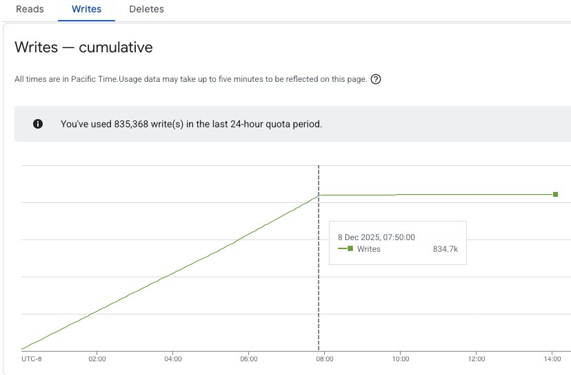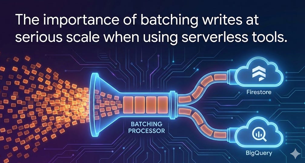 If you’ve used Firestore, you know it charges based on reads and writes. It’s incredibly cheap for small workloads, but when you go from 2 writes a second to 70, you are bulleting writes to the database at a rate that starts to make the billing dashboard look like a horror movie.